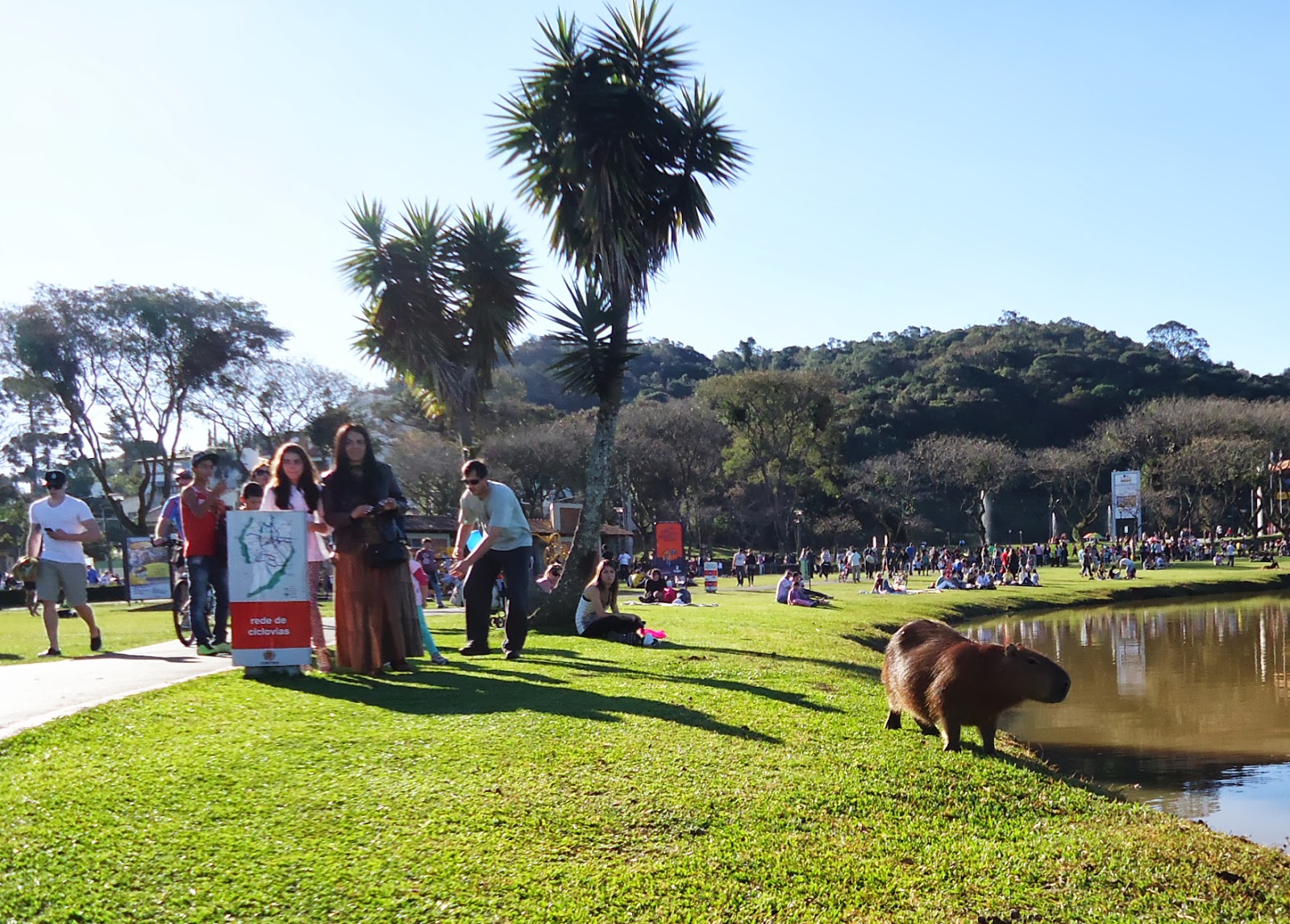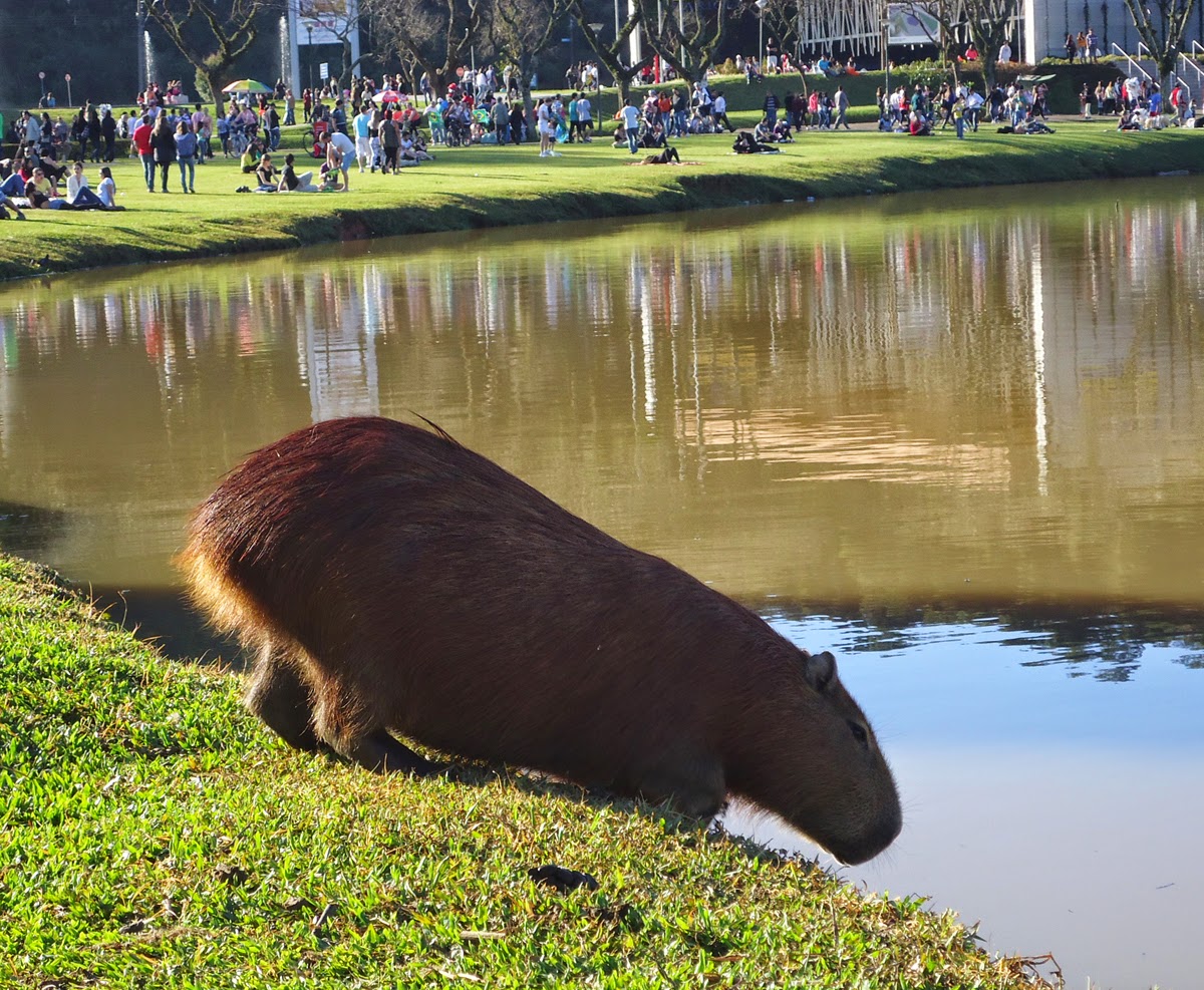 O domingo estava perfeito apesar do inverno de Curitiba, sol, temperatura agradável, parque cheio e a capivara nem aí para o pessoal, ela só se incomodou e saiu de cena quando tentei chegar mais perto para aquela foto de capa, mergulhou no lago e foi se encontrar com as outras.